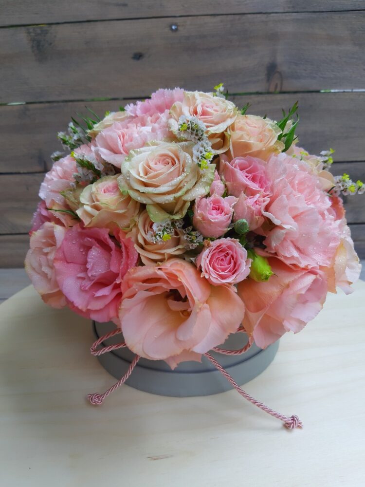 Vegyes virágdoboz,pasztell színekben,szürke dobozban,20 cm átmérővel